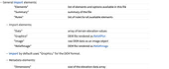"Elements" list of elements and options available in this file "Summary" summary of the file "Rules" list of rules for all available elements - Import elements:
