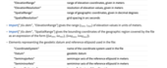 "Dimensions" size of the elevation data array "ElevationRange" range of elevation coordinates, given in meters "ElevationResolution" resolution of elevation values, given in meters "SpatialRange" range of geographic coordinates, given in decimal degrees "SpatialResolution" grid spacing in arc seconds - Import["file.dem","ElevationRange"] gives the range {zmin,zmax} of elevation values in units of meters.
