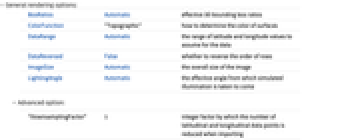 BoxRatios Automatic effective 3D bounding box ratios ColorFunction "Topographic" how to determine the color of surfaces DataRange Automatic the range of latitude and longitude values to assume for the data DataReversed False whether to reverse the order of rows ImageSize Automatic the overall size of the image LightingAngle Automatic the effective angle from which simulated illumination is taken to come - Advanced option: