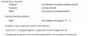 "Elements" list of elements and options available in this file "Summary" summary of the file "Rules" list of rules for all available elements - Data representation element: