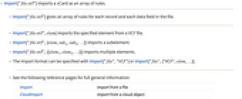 - Import["file.vcf",{{elem1,elem2,…}}] imports multiple elements.