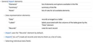 "Elements" list of elements and options available in this file "Summary" summary of the file "Rules" list of rules for all available elements - Data representation elements:
