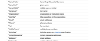 "NamePrefix" honorific prefix part of the name "NameFirst" given name "NameMiddle" middle name or initial "NameLast" last name "Organization" organization or institution name "JobTitle" title or position in the organization "Email" email addresses "Phone" phone numbers "Fax" fax numbers "MobilePhone" mobile phone numbers "BirthDate" birthday, given as a DateList specification "InstantMessaging" instant messaging addresses "Address1" street address "Address2" continued street address "POBox" post office box number, given as a string "City" city name "ZIPCode" ZIP code "State" state name or abbreviation "Country" country name - Import["file.vcf","City"] returns the city name for each record as a list of strings.