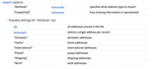"Attribute" Automatic specifies what address type to import "EmptyField" Automatic how missing information is represented - Possible settings for "Attribute" are: