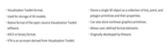 - Stores a single 3D object as a collection of line, point, and polygon primitives and their properties.