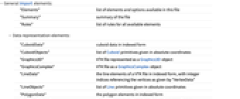 "CuboidData" cuboid data in indexed form "CuboidObjects" list of Cuboid primitives given in absolute coordinates "Graphics3D" VTK file represented as a Graphics3D object "GraphicsComplex" VTK file as a GraphicsComplex object "LineData" the line elements of a VTK file in indexed form, with integer indices referencing the vertices as given by "VertexData" "LineObjects" list of Line primitives given in absolute coordinates "PolygonData" the polygon elements in indexed form "PolygonObjects" list of Polygon primitives given in absolute coordinates "VertexData" list of vertex coordinates "PointData" point data in indexed form "PointObjects" list of Point primitives given in absolute coordinates - Import and Export use the "Graphics3D" element by default for VTK files.