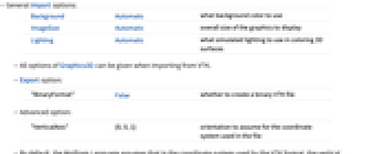 Background Automatic what background color to use ImageSize Automatic overall size of the graphics to display Lighting Automatic what simulated lighting to use in coloring 3D surfaces - All options of Graphics3D can be given when importing from VTK.