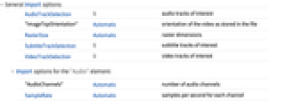 AudioTrackSelection 1 audio tracks of interest "ImageTopOrientation" Automatic orientation of the video as stored in the file RasterSize Automatic raster dimensions SubtitleTrackSelection 1 subtitle tracks of interest VideoTrackSelection 1 video tracks of interest - Import options for the "Audio" element: