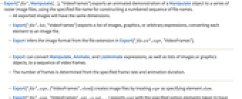 - Export can convert Manipulate, Animate, and ListAnimate expressions, as well as lists of images or graphics objects, to a sequence of video frames.