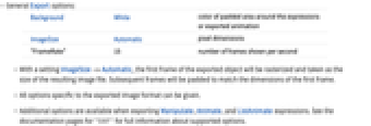 Background White color of padded area around the expressions or exported animation ImageSize Automatic pixel dimensions "FrameRate" 15 number of frames shown per second - With a setting ImageSize->Automatic, the first frame of the exported object will be rasterized and taken as the size of the resulting image file. Subsequent frames will be padded to match the dimensions of the first frame.