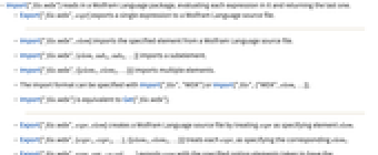 - Import["file.wdx"] reads in a Wolfram Language package, evaluating each expression in it and returning the last one.