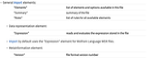 "Elements" list of elements and options available in this file "Summary" summary of the file "Rules" list of rules for all available elements - Data representation element: