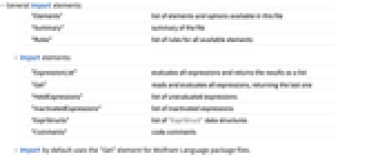 "ExpressionList" evaluates all expressions and returns the results as a list "Get" reads and evaluates all expressions, returning the last one "HeldExpressions" list of unevaluated expressions "InactivatedExpressions" list of inactivated expressions "ExprStructs" list of "ExprStruct" data structures "Comments" code comments - Import by default uses the "Get" element for Wolfram Language package files.