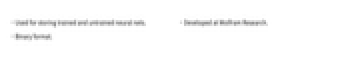 "Net" the net, including all initialized arrays "UninitializedNet" the net, without any arrays "ArrayList" parameter arrays as a list "ArrayAssociation" parameter arrays as an association "WLVersion" version of the Wolfram Language used to create the file