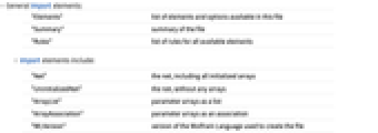 "Elements" list of elements and options available in this file "Summary" summary of the file "Rules" list of rules for all available elements - Import elements include: