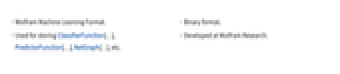- Used for storing ClassifierFunction[…], PredictorFunction[…], NetGraph[…], etc.