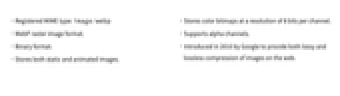 - Introduced in 2010 by Google to provide both lossy and lossless compression of images on the web.