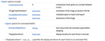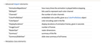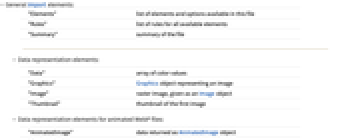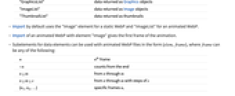 "Data" array of color values "Graphics" Graphics object representing an image "Image" raster image, given as an Image object "Thumbnail" thumbnail of the first image - Data representation elements for animated WebP files: