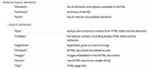 "Data" textual and numerical content from HTML table and list elements "FullData" full tabular content, including empty HTML table and list elements "Hyperlinks" hyperlinks, given as a list of strings "Plaintext" XHTML document formatted as text "Images" images embedded in the XHTML document "Source" raw XHTML source as a single string "Title" HTML page title "ImageLinks" URLs of embedded images "XMLObject" symbolic XML representation of the entire document - Import by default uses the "Plaintext" element.