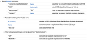"ConvertLinkedNotebooks" False whether to convert linked notebooks to HTML "CSS" Automatic what CSS stylesheet to use or link to "MathOutput" "GIF" how to represent typeset expressions "Content" False whether to export MathML content elements - Possible settings for "CSS" are: