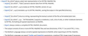"Data" textual and numerical content from HTML table and list elements "FullData" full tabular content, including empty HTML table and list elements "Hyperlinks" hyperlinks, given as a list of strings "Plaintext" XHTML+MathML document formatted as text "Images" images embedded in the XHTML document "Source" raw XHTML+MathML source as a single string "Title" XHTML page title "ImageLinks" URLs of embedded images "XMLObject" symbolic XML representation of the entire document - Import by default uses the "Plaintext" element.