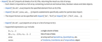 - Import["file.xls",{elem,sub1,…}] imports subelements specifically useful for partial data import.
