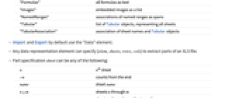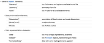 "Dimensions" association of sheet names and sheet dimensions "SheetCount" number of sheets "Sheets" list of sheet names - Data representation elements: