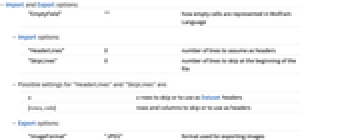 n n rows to skip or to use as Dataset headers {rows,cols} rows and columns to skip or to use as headers - Export options: