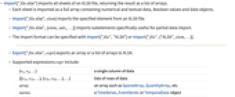 - Import["file.xlsx",{elem,sub1,…}] imports subelements specifically useful for partial data import.