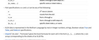 n nth sheet -n counts from the end name sheet name n;;m sheets n through m n;;m;;s sheets n through m with steps of s {n1,name,…} specific name or sheet index ni - Part specifications row and col can be any of the following: