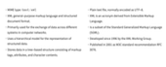 - Stores data in a tree-based structure consisting of markup tags, attributes, and character contents.
