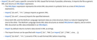 - Import["file.xml"] uses a specific converter for XML-based file formats if possible; otherwise, it imports the file as generic XML and returns an XMLObject expression.