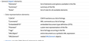 "Elements" list of elements and options available in this file "Summary" summary of the file "Rules" list of rules for all available elements - Data representation elements: