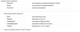 "Elements" list of elements and options available in this file "Rules" list of rules for all available elements "Summary" summary of properties - Data representation elements: