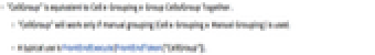 - "CellGroup" is equivalent to Cell ▶ Grouping ▶ Group Cells/Group Together.