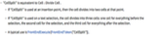 - If "CellSplit" is used on a text selection, the cell divides into three cells: one cell for everything before the selection, the second cell for the selection, and the third cell for everything after the selection.