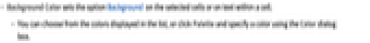 - Background Color sets the option Background on the selected cells or on text within a cell.