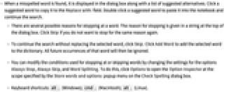 - When a misspelled word is found, it is displayed in the dialog box along with a list of suggested alternatives. Click a suggested word to copy it to the Replace with: field. Double-click a suggested word to paste it into the notebook and continue the search.