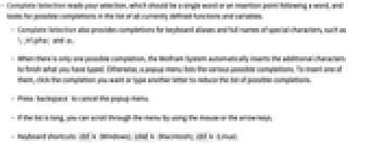 - Complete Selection reads your selection, which should be a single word or an insertion point following a word, and looks for possible completions in the list of all currently defined functions and variables.