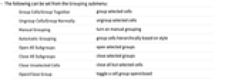 Group Cells/Group Together group selected cells Ungroup Cells/Group Normally ungroup selected cells Manual Grouping turn on manual grouping Automatic Grouping group cells hierarchically based on style Open All Subgroups open selected groups Close All Subgroups close selected groups Close Unselected Cells close all but selected cells Open/Close Group toggle a cell group open/closed