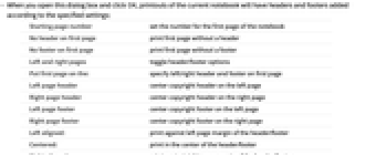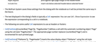 Starting page number set the number for the first page of the notebook No header on first page print first page without a header No footer on first page print first page without a footer Left and right pages toggle header/footer options Put first page on the: specify left/right header and footer on first page Left page header center copyright header on the left page Right page header center copyright header on the right page Left page footer center copyright footer on the left page Right page footer center copyright footer on the right page Left aligned: print against left page margin of the header/footer Centered: print in the center of the header/footer Right aligned: print against right page margin of the header/footer Include line insert rule below selected header/above selected footer - The Wolfram System saves these settings from the dialog with the notebook so it will be printed the same way in the future.