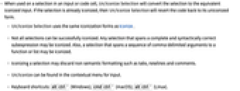 - When used on a selection in an input or code cell, Un/Iconize Selection will convert the selection to the equivalent iconized input. If the selection is already iconized, then Un/Iconize Selection will revert the code back to its uniconized form.