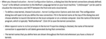 - When you choose Evaluation ▶ Kernel Configuration Options, a dialog box lists the kernel connections already defined. "Local" is the default connection to the Wolfram Language kernel on your local machine. "LinkSnooper" can be used to visualize the interactions over WSTP between the front end and a local kernel.