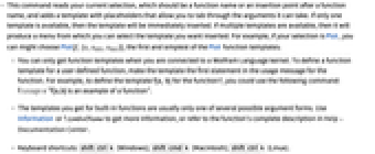 - This command reads your current selection, which should be a function name or an insertion point after a function name, and adds a template with placeholders that allow you to tab through the arguments it can take. If only one template is available, then the template will be immediately inserted. If multiple templates are available, then it will produce a menu from which you can select the template you want inserted. For example, if your selection is Plot, you can might choose Plot[f,{x,xmin,xmax}], the first and simplest of the Plot function templates.