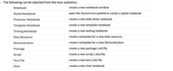 Notebook create a new notebook window Chat Notebook create a new chat-enabled notebook Styled Notebook open the Stylesheets palette to create a styled notebook Presenter Notebook create a new slide show notebook Wolfram | Alpha Notebook create a new Wolfram|Alpha notebook Template Notebook create a new template notebook Testing Notebook create a new testing notebook Form Notebook Authoring create a new form notebook Question Notebook Authoring create a new question notebook Wolfram Language Package create a new package (.wl) file WolframScript Script create a new script (.wls) file Function Resource create a template for a new function resource Data Resource create a template for a new data resource Demonstration create a template for a new Demonstration Paclet Resource create a template for a new paclet resource Example Resource create a template for a new example resource Prompt Resource create a template for a new prompt resource Computational Essay create a template for a new computational essay Guide Page create a new guide page Text File create a new text (.txt) file - The new file is initially empty.