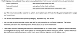 to go to the next match. - Each line in the list of options gives the option name followed by its current value. Change the option's value by choosing from the popup menu at the right or by selecting the value itself and typing over it. A symbol in front of the option name indicates that the current value of the option is different from its default value.