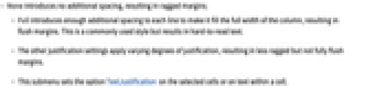 - Full introduces enough additional spacing to each line to make it fill the full width of the column, resulting in flush margins. This is a commonly used style but results in hard-to-read text.