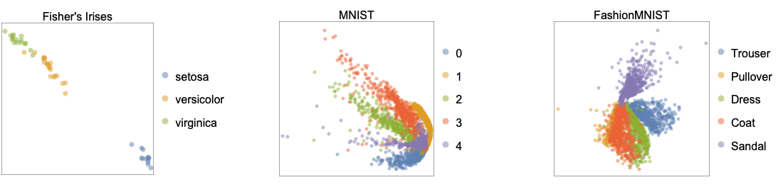 - The following feature-space plots (see FeatureSpacePlot) show two-dimensional embeddings learned by the "Autoencoder" method applied to the benchmarking datasets Fisher's Irises, MNIST and FashionMNIST: