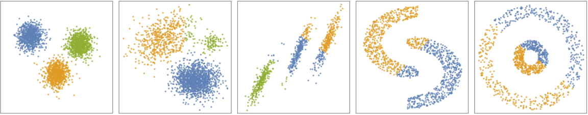 - The following plots show the results of the "KMeans" method applied to toy datasets: