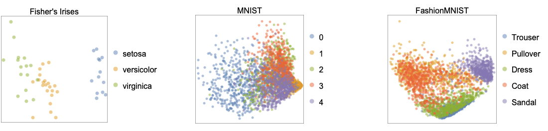 - The following plots show the results of the "Linear" method applied to benchmark datasets Fisher's Irises, MNIST and FashionMNIST: